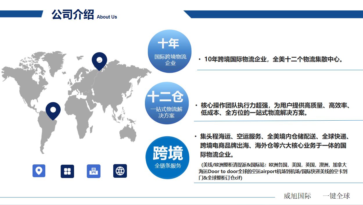 本公司是中华人民共和国外经贸部和国家工商局批准,集无船承运、国际货运、报关业务与物流咨询服务于一体的综合型物流企业。公司具备美国海运FMC资质、中国海运NVOCC资质。公司致力于中国传统国际货运及跨境电商物流的经营和创造。