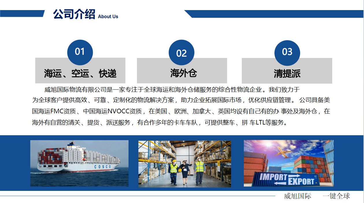 威旭国际物流有限公司属国际一级货运代理有限公司,是一家为直客提供服务的货代公司。2019年成立至今,始终秉承专业、优质、诚信、高效的服务理念。我司有雄厚的经济基础,强大的全球关系网络,完善的人员配置,有较好的口碑和信誉。在假发领域,机械领域,家具领域,食品领域、运动器材领域内是很多商家的首选合作伙伴! 同时,本公司是中华人民共和国外经贸部和国家工商局批准,集无船承运、国际货运、报关业务与物流咨询服务于一体的综合型物流企业。公司具备美国海运FMC资质、中国海运NVOCC资质。也与船东、港区、海关保持着较好的合作关系。以客户至上的经营理念,为客户提供周密专业的运输方案。让顾客放心,安心,省心!